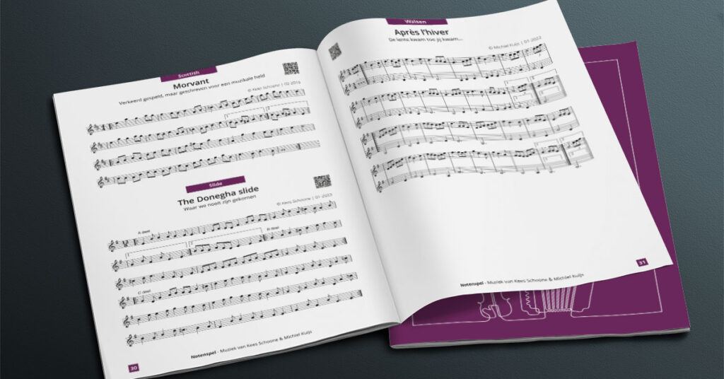 Deze site zag het licht op 30 januari 2024, tegelijkertijd verscheen ook het boek Notenspel waarin alle tunes staan zoals die op dat moment op de site gepubliceerd waren. Ruim 50 deunen gebundeld in een mooie uitgave. Wil jij graag het boek ontvangen? Van de eerste oplage zijn nog enkele exemplaren beschikbaar. We vragen er € 10,- voor en voor € 5,- extra sturen we het je graag toe. Stuur je verzoek naar info@michielkuijs.nl.